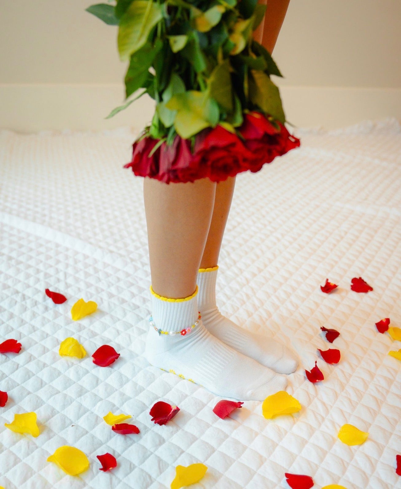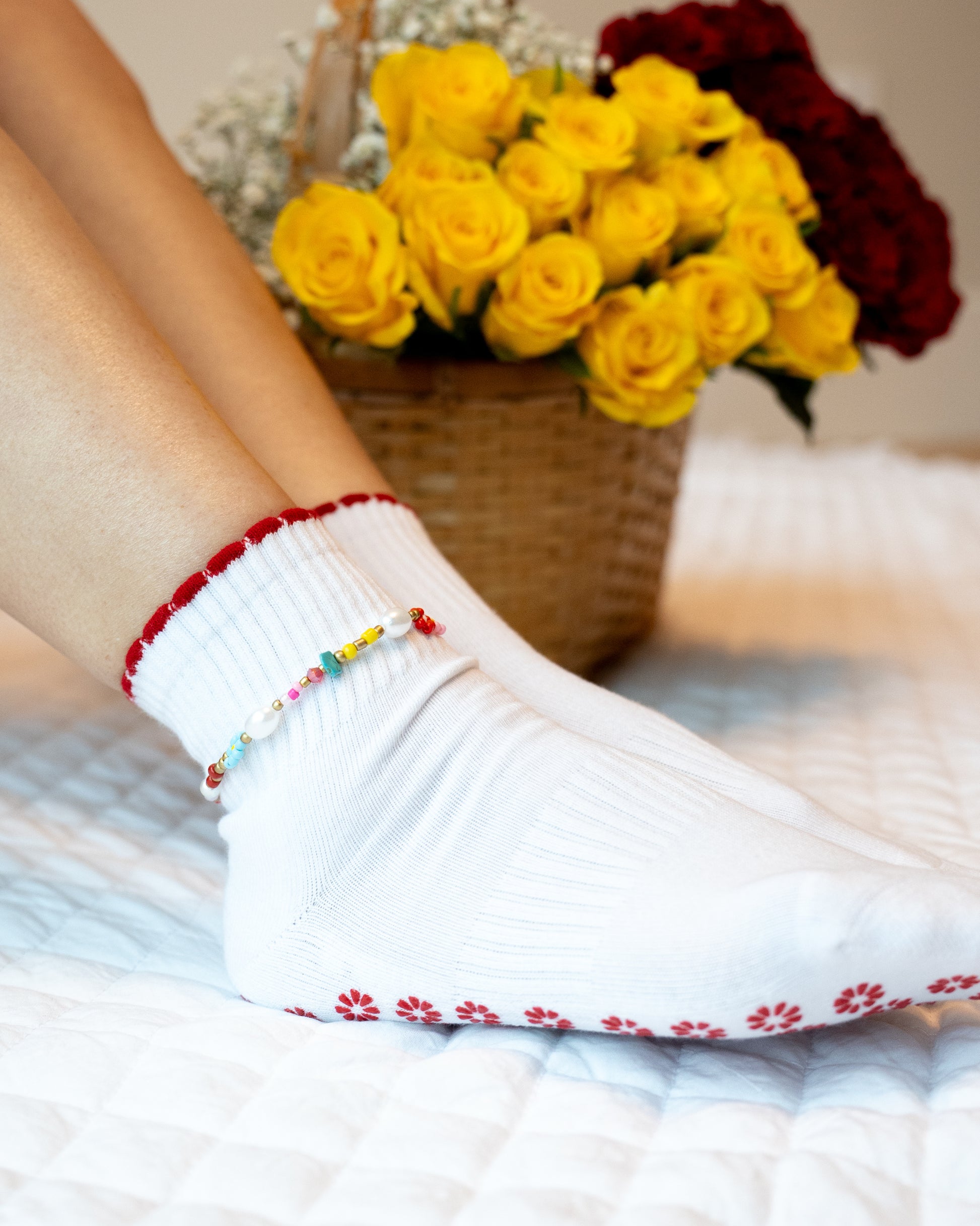 Ruffle edged ankle length socks in sunny yellow and bright red, paired with a matching anklet. Light, playful, and perfect for spring days.